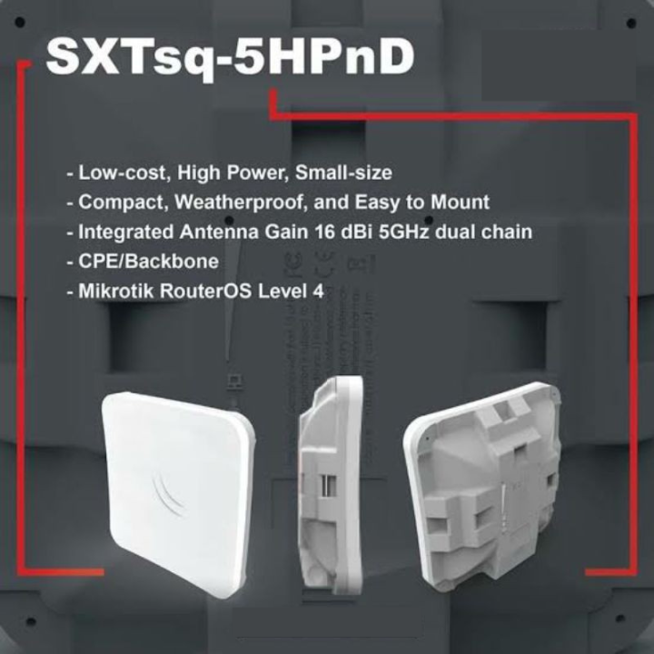 رادیو وایرلس میکروتیک مدل (SXTsq 5 HP (High Power .یک دستگاه رادیو وایرلس با قدرت خروجی بالا در فرکانس 5 گیگاهرتز می باشد. که برای کار در محیط های بیرونی در ارتباط های point to point تا مسافت 6km مناسب است. و یا به عنوان بخش مرکزی شبکه یا تجهیزات سمت کاربر در ارتباط های Point to multi Point طراحی و تولید شده است.